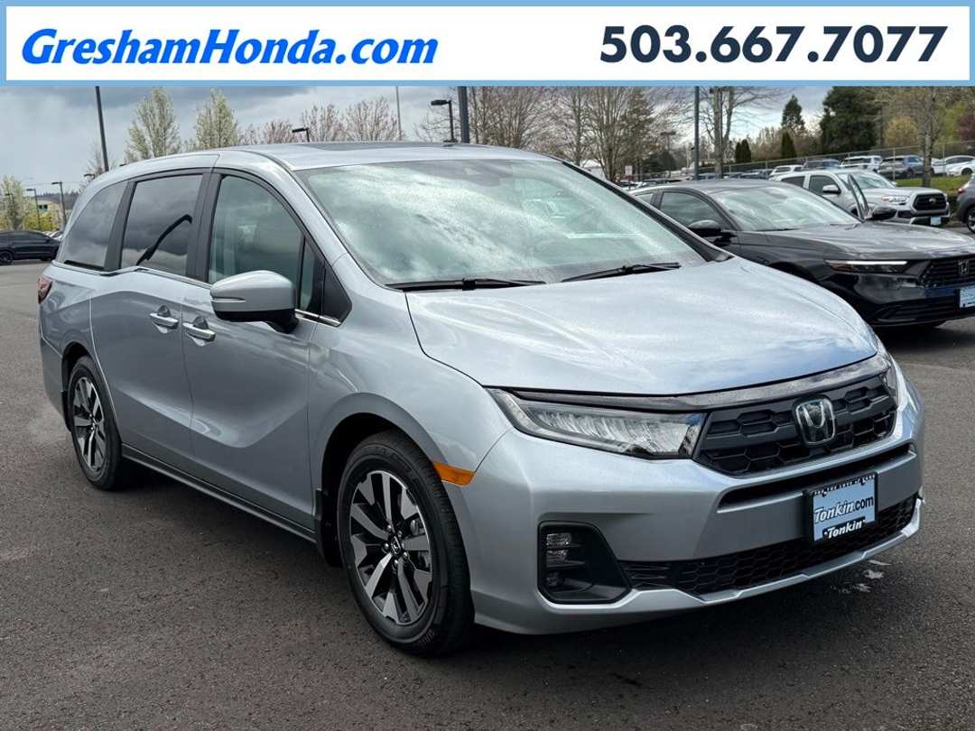Please Note this price does not include any dealer added accessories. This vehicle is located at Tonkin Gresham Honda Please call to learn more! . 2026 Honda Odyssey EX-L 4D Passenger Van 3.5L V6 SOHC i-VTEC 24V 10-Speed Automatic FWD Solar Silver Metallic 18" Machine-Finished Alloy Wheels, 3rd row seats: split-bench, 4-Wheel Disc Brakes, 7 Speakers, ABS brakes, Adaptive Cruise Control: Adaptive Cruise Control (ACC) with Low-Speed Follow, Air Conditioning, Alloy wheels, AM/FM radio: SiriusXM, Anti-whiplash front head restraints, Apple CarPlay/Android Auto, Auto High-beam Headlights, Auto-dimming Rear-View mirror, Automatic temperature control, Blind Spot Information (BSI) System warning, Body Colored Door Edge Guards, Brake assist, Bumpers: body-color, Delay-off headlights, Driver door bin, Driver vanity mirror, Driver's Seat Mounted Armrest, Dual front impact airbags, Dual front side impact airbags, Electronic Stability Control, Exterior Parking Camera Rear, Four wheel independent suspension, Front anti-roll bar, Front Bucket Seats, Front dual zone A/C, Front fog lights, Front reading lights, Fully automatic headlights, Garage door transmitter: HomeLink, Heated door mirrors, Heated Front Bucket Seats, Heated front seats, Illuminated entry, Knee airbag, Lane departure: Lane Keeping Assist System (LKAS) active, Leather steering wheel, Leather-Trimmed Seats, Low tire pressure warning, Memory seat, Occupant sensing airbag, Outside temperature display, Overhead airbag, Overhead console, Panic alarm, Passenger door bin, Passenger seat mounted armrest, Passenger vanity mirror, Power door mirrors, Power driver seat, Power Liftgate, Power moonroof, Power passenger seat, Power steering, Power windows, Radio data system, Radio: 160-Watt AM/FM/HD/SiriusXM Audio System, Rear air conditioning, Rear anti-roll bar, Rear reading lights, Rear seat center armrest, Rear window defroster, Rear window wiper, Reclining 3rd row seat, Remote keyless entry, Security system, Speed control, Speed-sensing steering, Speed-Sensitive Wipers, Split folding rear seat, Spoiler, Steering wheel mounted audio controls, Tachometer, Telescoping steering wheel, Tilt steering wheel, Traction control, Trip computer, Turn signal indicator mirrors, Variably intermittent wipers.