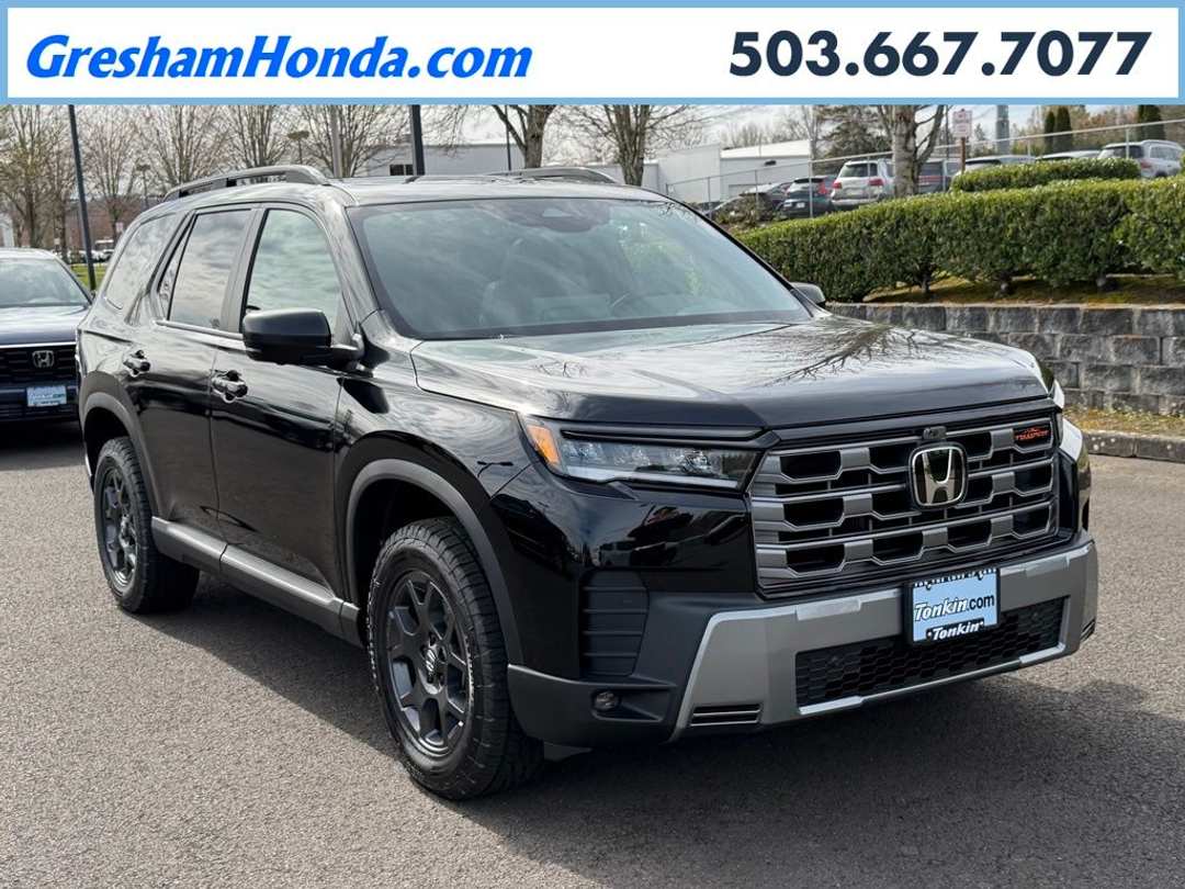 Please Note this price does not include any dealer added accessories. This vehicle is located at Tonkin Gresham Honda Please call to learn more! . 2026 Honda Pilot TrailSport 4D Sport Utility 3.5L V6 DOHC 24V 10-Speed Automatic AWD Crystal Black Pearl 3rd row seats: split-bench, 4-Wheel Disc Brakes, 9 Speakers, ABS brakes, Adaptive Cruise Control: Adaptive Cruise Control (ACC) with Low-Speed Follow, Air Conditioning, Alloy wheels, Apple CarPlay/Android Auto, Auto High-beam Headlights, Auto-dimming Rear-View mirror, Automatic temperature control, Blind Spot Information (BSI) System warning, Brake assist, Bumpers: body-color, Compass, Delay-off headlights, Driver door bin, Driver vanity mirror, Dual front impact airbags, Dual front side impact airbags, Durable Synthetic Leather Seat Trim, Electronic Stability Control, Emergency communication system: HondaLink, Exterior Parking Camera Rear, Four wheel independent suspension, Front anti-roll bar, Front Bucket Seats, Front Center Armrest, Front dual zone A/C, Front fog lights, Front reading lights, Fully automatic headlights, Garage door transmitter: HomeLink, Heated door mirrors, Heated Front Bucket Seats, Heated front seats, Heated rear seats, Heated steering wheel, HondaLink, HondaLink Subscription Services, Illuminated entry, Knee airbag, Lane departure: Lane Keeping Assist System (LKAS) active, Low tire pressure warning, Memory seat, Navigation system: Google Maps, Occupant sensing airbag, Outside temperature display, Overhead airbag, Overhead console, Panic alarm, Passenger door bin, Passenger vanity mirror, Power door mirrors, Power driver seat, Power Liftgate, Power moonroof, Power passenger seat, Power steering, Power windows, Radio data system, Radio: 245-Watt Audio System, Rear air conditioning, Rear anti-roll bar, Rear reading lights, Rear window defroster, Rear window wiper, Reclining 3rd row seat, Remote keyless entry, Security system, Speed control, Speed-sensing steering, Speed-Sensitive Wipers, Split folding rear seat, Spoiler, Steering wheel mounted audio controls, Tachometer, Telescoping steering wheel, Tilt steering wheel, Traction control, Trip computer, Turn signal indicator mirrors, Variably intermittent wipers, Wheels: 18" Shark Gray with Black Lug Nuts.