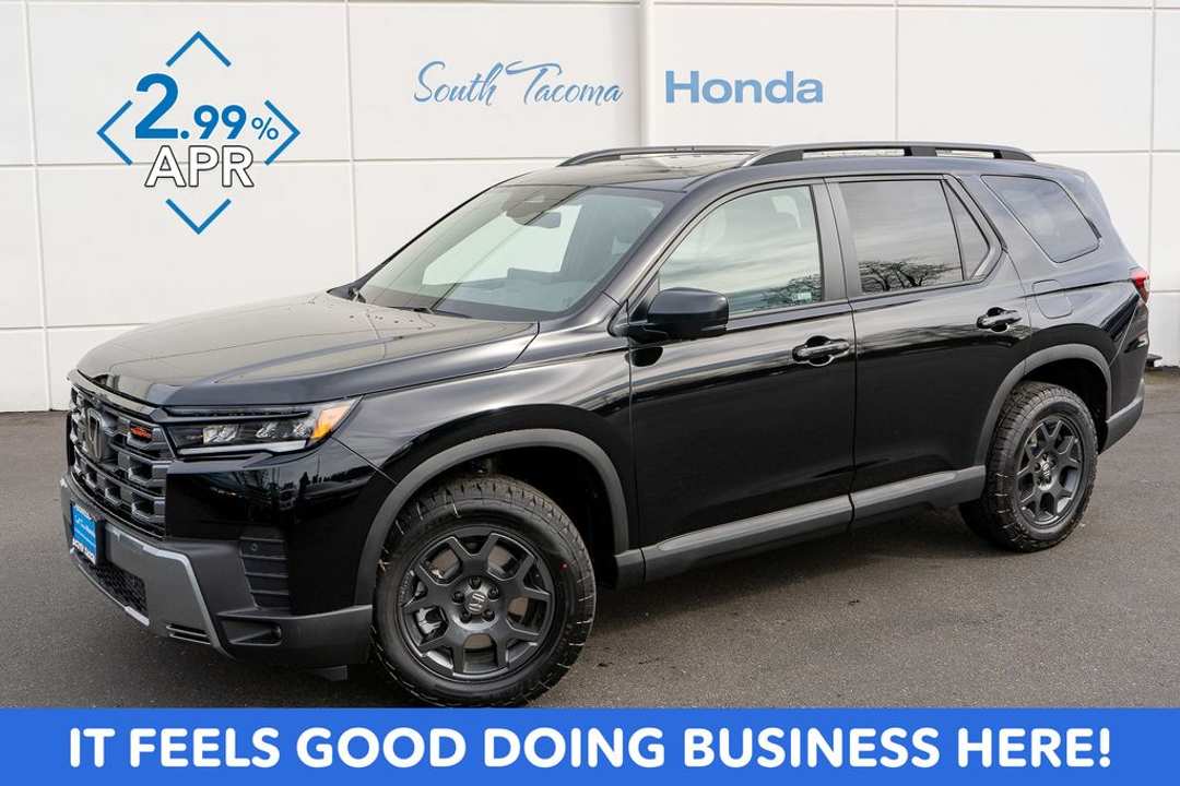 DISCOUNTED PRICING DOES NOT INCLUDE ANY DEALER INSTALLED ACCESSORIES. MAY NOT BE USED IN CONJUNCTION WITH ANY OTHER OFFERS. SEE DEALER FOR COMPLETE DETAILS. SALE PRICE EXPIRES 3/31/26. VEHICLE IS SUBJECT TO PRIOR SALE SO PLEASE CONTACT DEALER FOR AVAILABILITY. ALL OFFERS AND SALES CONTINGENT ON THE VEHICLE BEING TITLED IN WASHINGTON STATE.3rd row seats: split-bench, 4-Wheel Disc Brakes, 9 Speakers, ABS brakes, Adaptive Cruise Control: Adaptive Cruise Control (ACC) with Low-Speed Follow, Air Conditioning, Alloy wheels, Apple CarPlay/Android Auto, Auto High-beam Headlights, Auto-dimming Rear-View mirror, Automatic temperature control, Blind Spot Information (BSI) System warning, Brake assist, Bumpers: body-color, Compass, Delay-off headlights, Driver door bin, Driver vanity mirror, Dual front impact airbags, Dual front side impact airbags, Durable Synthetic Leather Seat Trim, Electronic Stability Control, Emergency communication system: HondaLink, Exterior Parking Camera Rear, Four wheel independent suspension, Front anti-roll bar, Front Bucket Seats, Front Center Armrest, Front dual zone A/C, Front fog lights, Front reading lights, Fully automatic headlights, Garage door transmitter: HomeLink, Heated door mirrors, Heated Front Bucket Seats, Heated front seats, Heated rear seats, Heated steering wheel, HondaLink, HondaLink Subscription Services, Illuminated entry, Knee airbag, Lane departure: Lane Keeping Assist System (LKAS) active, Low tire pressure warning, Memory seat, Navigation system: Google Maps, Occupant sensing airbag, Outside temperature display, Overhead airbag, Overhead console, Panic alarm, Passenger door bin, Passenger vanity mirror, Power door mirrors, Power driver seat, Power Liftgate, Power moonroof, Power passenger seat, Power steering, Power windows, Radio data system, Radio: 245-Watt Audio System, Rear air conditioning, Rear anti-roll bar, Rear reading lights, Rear window defroster, Rear window wiper, Reclining 3rd row seat, Remote keyless entry, Security system, Speed control, Speed-sensing steering, Speed-Sensitive Wipers, Split folding rear seat, Spoiler, Steering wheel mounted audio controls, Tachometer, Telescoping steering wheel, Tilt steering wheel, Traction control, Trip computer, Turn signal indicator mirrors, Variably intermittent wipers, Wheels: 18" Shark Gray with Black Lug Nuts.2026 Honda Pilot Crystal Black Pearl TrailSport 3.5L V6 DOHC 24V 10-Speed Automatic AWD 4D Sport Utility