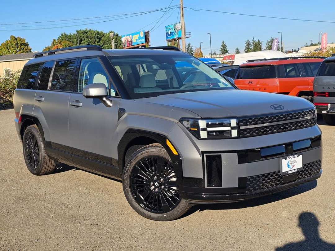 2026 Hyundai Santa Fe Hybrid CalligraphyI4 6-Speed Automatic with Shiftronic AWD 4D Sport Utility Ecotronic Gray Matte I4, 12 Speakers, 3rd row seats: bench, 4-Wheel Disc Brakes, ABS brakes, Air Conditioning, All Season Fitted Liners, Alloy wheels, AM/FM radio: SiriusXM, Apple CarPlay & Android Auto, Auto High-beam Headlights, Auto-dimming Rear-View mirror, Automatic temperature control, Brake assist, Bumpers: body-color, Cargo Cover/Screen, Cargo Net, Cargo Tray, Carpeted Floor Mats, Delay-off headlights, Driver door bin, Driver vanity mirror, Dual front impact airbags, Dual front side impact airbags, Electronic Stability Control, Emergency communication system, Exterior Parking Camera Rear, First Aid Kit, Four wheel independent suspension, Front anti-roll bar, Front Bucket Seats, Front Center Armrest, Front dual zone A/C, Front reading lights, Fully automatic headlights, Garage door transmitter: HomeLink, Heads-Up Display, Heated and Ventilated Front Bucket Seats, Heated door mirrors, Heated front seats, Heated rear seats, Heated steering wheel, Illuminated entry, Knee airbag, Leather steering wheel, Low tire pressure warning, Memory seat, Navigation System, Occupant sensing airbag, Option Group 01, Outside temperature display, Overhead airbag, Overhead console, Panic alarm, Passenger door bin, Passenger vanity mirror, Power door mirrors, Power driver seat, Power Liftgate, Power moonroof, Power passenger seat, Power steering, Power windows, Quilted Premium Nappa Leather Seat Trim, Radio: AM/FM/HD Bose Premium Audio System, Rain sensing wipers, Rear anti-roll bar, Rear side impact airbag, Rear window defroster, Rear window wiper, Remote keyless entry, Security system, Severe Weather Kit, Speed control, Speed-sensing steering, Split folding rear seat, Spoiler, Steering wheel mounted audio controls, Tachometer, Telescoping steering wheel, Tilt steering wheel, Traction control, Trip computer, Turn signal indicator mirrors, Variably intermittent wipers, Ventilated front seats, Wheels: 20" x 8.5J Unique Dark Finish Alloy, I4. Prices good through 5-31-2025. Kirkland Price includes:$2000 - Retail Bonus Cash