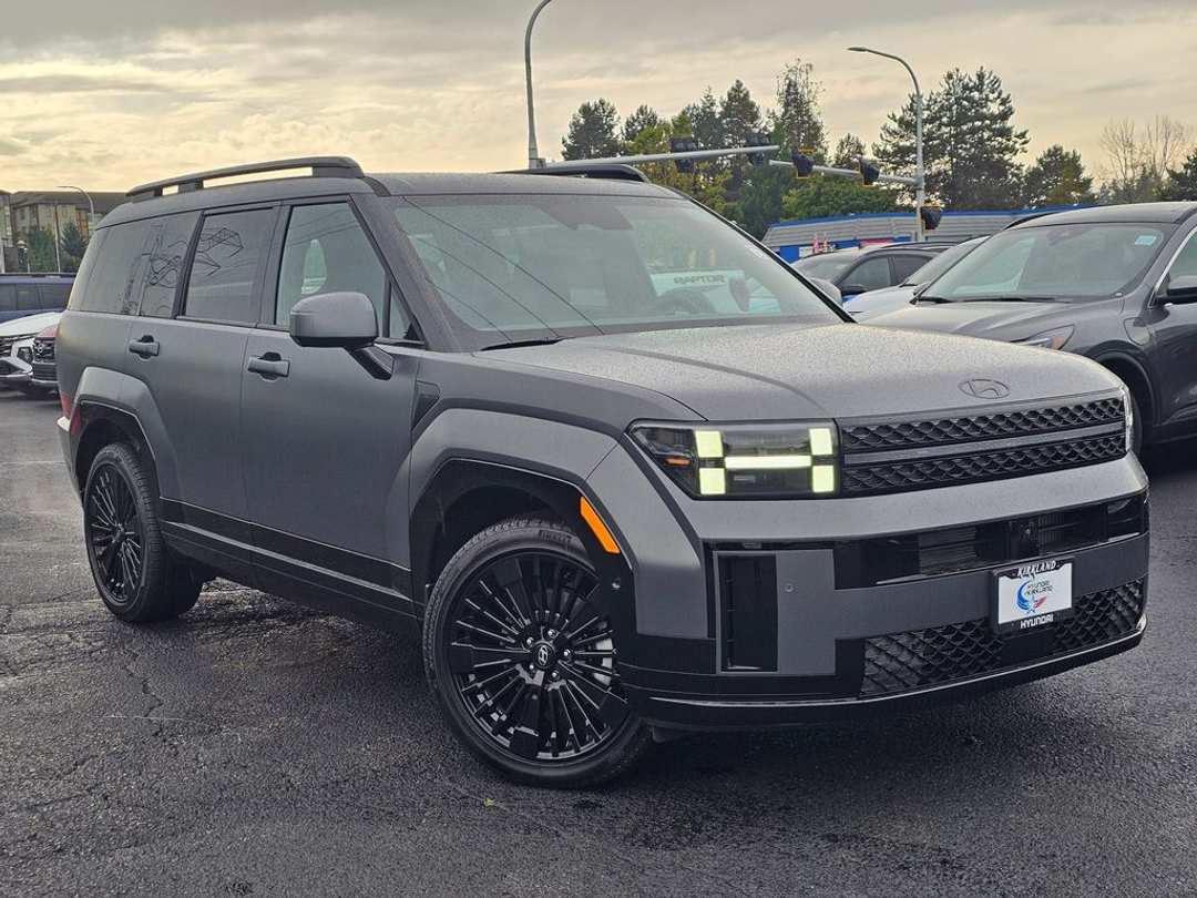 2026 Hyundai Santa Fe Hybrid CalligraphyI4 6-Speed Automatic with Shiftronic AWD 4D Sport Utility Ecotronic Gray Matte I4, 12 Speakers, 3rd row seats: bench, 4-Wheel Disc Brakes, ABS brakes, Air Conditioning, Alloy wheels, AM/FM radio: SiriusXM, Apple CarPlay & Android Auto, Auto High-beam Headlights, Auto-dimming Rear-View mirror, Automatic temperature control, Brake assist, Bumpers: body-color, Cargo Blocks, Cargo Net, Cargo Tray, Carpeted Floor Mats, Delay-off headlights, Driver door bin, Driver vanity mirror, Dual front impact airbags, Dual front side impact airbags, Electronic Stability Control, Emergency communication system, Exterior Parking Camera Rear, First Aid Kit, Four wheel independent suspension, Front anti-roll bar, Front Bucket Seats, Front Center Armrest, Front dual zone A/C, Front reading lights, Fully automatic headlights, Garage door transmitter: HomeLink, Heads-Up Display, Heated and Ventilated Front Bucket Seats, Heated door mirrors, Heated front seats, Heated rear seats, Heated steering wheel, Illuminated entry, Knee airbag, Leather steering wheel, Low tire pressure warning, Memory seat, Mudguards, Navigation System, Occupant sensing airbag, Option Group 01, Outside temperature display, Overhead airbag, Overhead console, Panic alarm, Passenger door bin, Passenger vanity mirror, Power door mirrors, Power driver seat, Power Liftgate, Power moonroof, Power passenger seat, Power steering, Power windows, Quilted Premium Nappa Leather Seat Trim, Radio: AM/FM/HD Bose Premium Audio System, Rain sensing wipers, Rear anti-roll bar, Rear side impact airbag, Rear window defroster, Rear window wiper, Remote keyless entry, Roof Rack Crossbars, Security system, Speed control, Speed-sensing steering, Split folding rear seat, Spoiler, Steering wheel mounted audio controls, Tachometer, Telescoping steering wheel, Tilt steering wheel, Traction control, Transverse Panel, Trip computer, Turn signal indicator mirrors, Variably intermittent wipers, Ventilated front seats, Wheels: 20" x 8.5J Unique Dark Finish Alloy, I4. Prices good through 5-31-2025. Kirkland Price includes:$4000 - Hyundai HMF Dealer Choice : $4000 discount and 5.39% APR for 24 months. $44.05 per $1000 financed. Available to well qualified buyers who finance through Hyundai Motor Finance. H704.