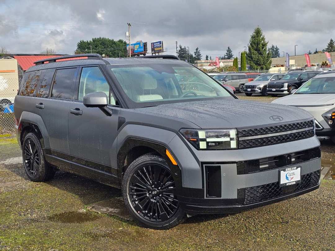 2026 Hyundai Santa Fe Hybrid CalligraphyI4 6-Speed Automatic with Shiftronic AWD 4D Sport Utility Ecotronic Gray Matte I4, 12 Speakers, 3rd row seats: bench, 4-Wheel Disc Brakes, ABS brakes, Air Conditioning, Alloy wheels, AM/FM radio: SiriusXM, Apple CarPlay & Android Auto, Auto High-beam Headlights, Auto-dimming Rear-View mirror, Automatic temperature control, Brake assist, Bumpers: body-color, Cargo Net, Cargo Tray, Carpeted Floor Mats, Delay-off headlights, Driver door bin, Driver vanity mirror, Dual front impact airbags, Dual front side impact airbags, Electronic Stability Control, Emergency communication system, Exterior Parking Camera Rear, First Aid Kit, Four wheel independent suspension, Front anti-roll bar, Front Bucket Seats, Front Center Armrest, Front dual zone A/C, Front reading lights, Fully automatic headlights, Garage door transmitter: HomeLink, Heads-Up Display, Heated and Ventilated Front Bucket Seats, Heated door mirrors, Heated front seats, Heated rear seats, Heated steering wheel, Illuminated entry, Knee airbag, Leather steering wheel, Low tire pressure warning, Memory seat, Mudguards, Navigation System, Occupant sensing airbag, Option Group 01, Outside temperature display, Overhead airbag, Overhead console, Panic alarm, Passenger door bin, Passenger vanity mirror, Power door mirrors, Power driver seat, Power Liftgate, Power moonroof, Power passenger seat, Power steering, Power windows, Quilted Premium Nappa Leather Seat Trim, Radio: AM/FM/HD Bose Premium Audio System, Rain sensing wipers, Rear anti-roll bar, Rear side impact airbag, Rear window defroster, Rear window wiper, Remote keyless entry, Roof Rack Crossbars, Security system, Severe Weather Kit, Speed control, Speed-sensing steering, Split folding rear seat, Spoiler, Steering wheel mounted audio controls, Tachometer, Telescoping steering wheel, Tilt steering wheel, Traction control, Trip computer, Turn signal indicator mirrors, Variably intermittent wipers, Ventilated front seats, Wheels: 20" x 8.5J Unique Dark Finish Alloy, I4. Prices good through 5-31-2025. Kirkland Price includes:$2000 - Retail Bonus Cash