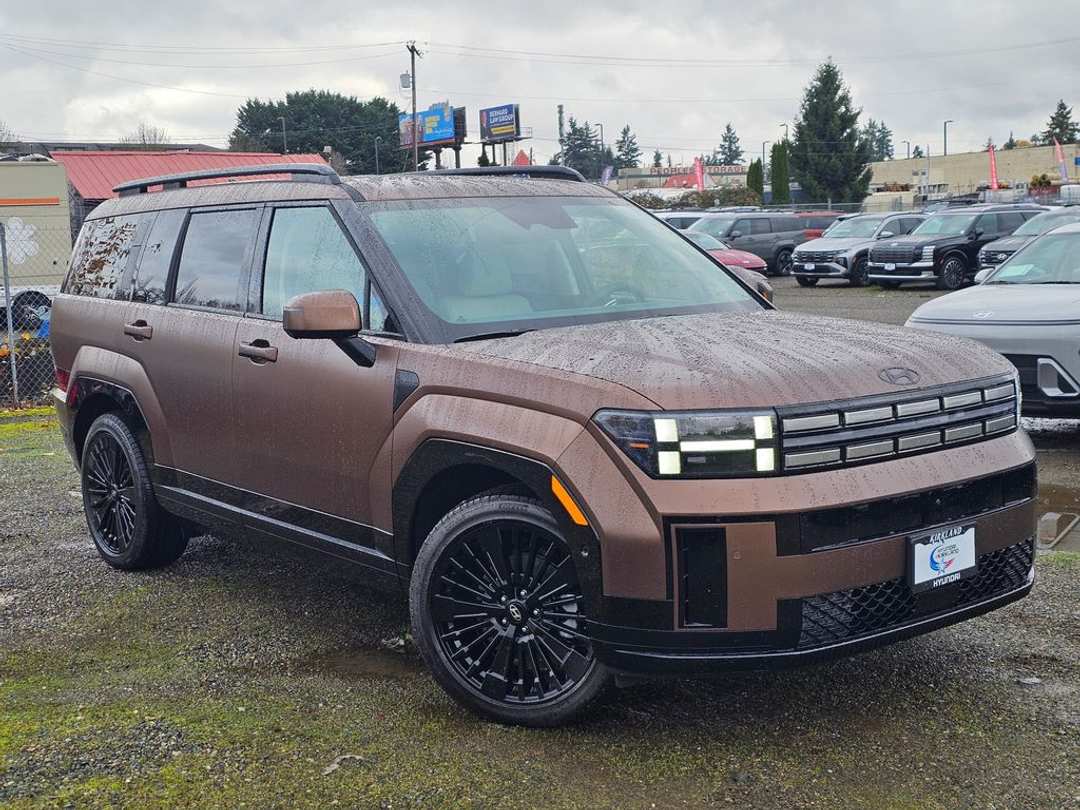 2026 Hyundai Santa Fe Hybrid CalligraphyI4 6-Speed Automatic with Shiftronic AWD 4D Sport Utility Earthy Brass Matte I4, 12 Speakers, 3rd row seats: bench, 4-Wheel Disc Brakes, ABS brakes, Air Conditioning, All Season Fitted Liners, Alloy wheels, AM/FM radio: SiriusXM, Apple CarPlay & Android Auto, Auto High-beam Headlights, Auto-dimming Rear-View mirror, Automatic temperature control, Brake assist, Bumpers: body-color, Cargo Cover/Screen, Cargo Net, Cargo Tray, Carpeted Floor Mats, Delay-off headlights, Driver door bin, Driver vanity mirror, Dual front impact airbags, Dual front side impact airbags, Electronic Stability Control, Emergency communication system, Exterior Parking Camera Rear, First Aid Kit, Four wheel independent suspension, Front anti-roll bar, Front Bucket Seats, Front Center Armrest, Front dual zone A/C, Front reading lights, Fully automatic headlights, Garage door transmitter: HomeLink, Heads-Up Display, Heated and Ventilated Front Bucket Seats, Heated door mirrors, Heated front seats, Heated rear seats, Heated steering wheel, Illuminated entry, Knee airbag, Leather steering wheel, Low tire pressure warning, Memory seat, Navigation System, Occupant sensing airbag, Option Group 01, Outside temperature display, Overhead airbag, Overhead console, Panic alarm, Passenger door bin, Passenger vanity mirror, Power door mirrors, Power driver seat, Power Liftgate, Power moonroof, Power passenger seat, Power steering, Power windows, Quilted Premium Nappa Leather Seat Trim, Radio: AM/FM/HD Bose Premium Audio System, Rain sensing wipers, Rear anti-roll bar, Rear side impact airbag, Rear window defroster, Rear window wiper, Remote keyless entry, Roadside Assistance Kit, Security system, Speed control, Speed-sensing steering, Split folding rear seat, Spoiler, Steering wheel mounted audio controls, Tachometer, Telescoping steering wheel, Tilt steering wheel, Traction control, Trip computer, Turn signal indicator mirrors, Variably intermittent wipers, Ventilated front seats, Wheels: 20" x 8.5J Unique Dark Finish Alloy, I4. Prices good through 5-31-2025. Kirkland Price includes:$2000 - Retail Bonus Cash