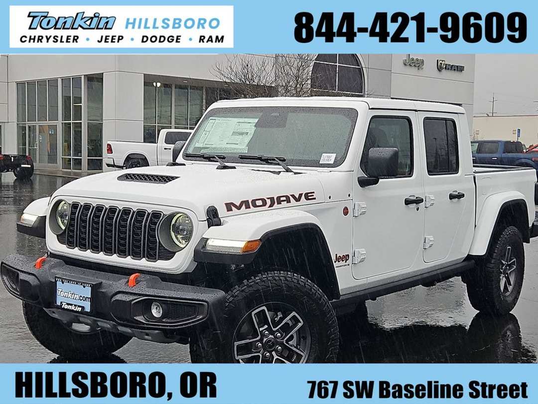 2026 Jeep Gladiator Mojave Bright White Clearcoat 3.6L V6 24V VVT 4WD 8-Speed Automatic110 Mph Vehicle Max Speed Calibration, 12.3" Touchscreen Display, 4-Wheel Disc Brakes, 4.10 Rear Axle Ratio, 4G LTE Wi-Fi Hot Spot, 8 Speakers, ABS brakes, Air Conditioning, Alexa Built-in, Alloy wheels, AM/FM radio: SiriusXM with 360L, Apple CarPlay, Apple CarPlay/Android Auto, Automatic temperature control, Body Color 3-Piece Hard Top, Body Color Rubicon Highline Flare, Brake assist, Compass, Connectivity - US/Canada, Convenience Group, Delay-off headlights, Driver door bin, Driver vanity mirror, Dual front impact airbags, Dual front side impact airbags, Electronic Stability Control, Emergency communication system: Jeep Connect, For Details, Visit DriveUconnect.com, Freedom Panel Storage Bag, Front anti-roll bar, Front Bucket Seats, Front Center Armrest w/Storage, Front dual zone A/C, Front fog lights, Front License Plate Bracket, Front reading lights, Fully automatic headlights, Google Android Auto, Heated door mirrors, Heated Front Seats, Heated Steering Wheel, Heavy Duty Suspension with Gas Shocks, Illuminated entry, Integrated Center Stack Radio, Integrated roll-over protection, Low tire pressure warning, MyFlexCare Service Plan, Occupant sensing airbag, Outside temperature display, Overhead airbag, Panic alarm, Passenger door bin, Passenger vanity mirror, Power door mirrors, Power steering, Power windows, Premium Cloth Seats with Sport Bolsters, Quick Order Package 24D Mojave, Radio data system, Radio: Uconnect 5 with 12.3" Display, Rear anti-roll bar, Rear reading lights, Rear Sliding Window, Rear Window Defroster, Remote keyless entry, Remote Start System, Security system, SiriusXM Radio Service, SiriusXM with 360L, Speed control, Split folding rear seat, Steering wheel mounted audio controls, Tachometer, Telescoping steering wheel, Tilt steering wheel, Traction control, Trip computer, Universal Garage Door Opener, USB Host Flip, Variably intermittent wipers, Voltmeter, Wheels: 17" x 7.5" Dark Gray Painted. Price includes: $1000 - 2026 National Retail Bonus Cash . Exp. 04/30/2026