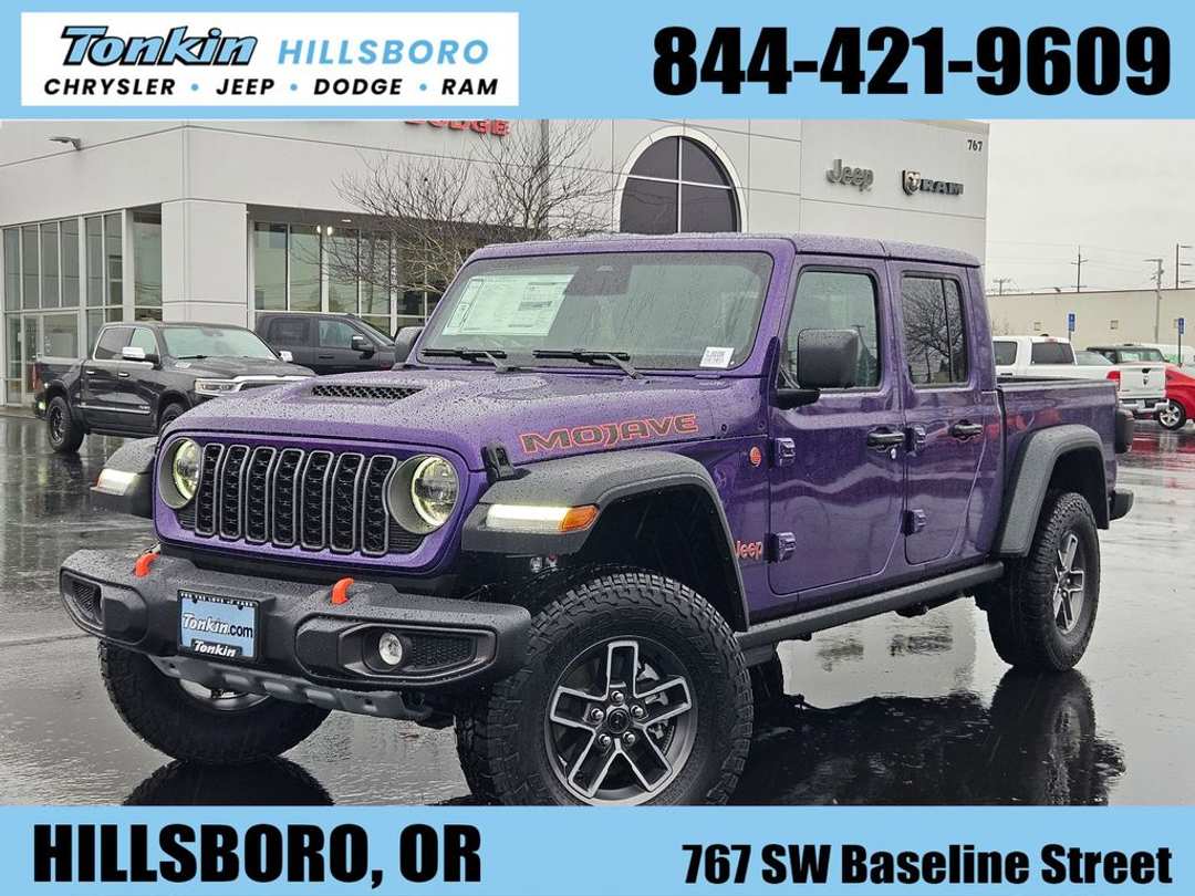 2026 Jeep Gladiator Mojave reign 3.6L V6 24V VVT 4WD 8-Speed Automatic110 Mph Vehicle Max Speed Calibration, 12.3" Touchscreen Display, 4-Wheel Disc Brakes, 4.10 Rear Axle Ratio, 4G LTE Wi-Fi Hot Spot, 8 Speakers, ABS brakes, Air Conditioning, Alexa Built-in, Alloy wheels, AM/FM radio: SiriusXM with 360L, Apple CarPlay, Apple CarPlay/Android Auto, Automatic temperature control, Body Color 3-Piece Hard Top, Brake assist, Compass, Connectivity - US/Canada, Convenience Group, Delay-off headlights, Driver door bin, Driver vanity mirror, Dual front impact airbags, Dual front side impact airbags, Electronic Stability Control, Emergency communication system: Jeep Connect, Freedom Panel Storage Bag, Front anti-roll bar, Front Bucket Seats, Front Center Armrest w/Storage, Front dual zone A/C, Front fog lights, Front License Plate Bracket, Front reading lights, Fully automatic headlights, Google Android Auto, Heated door mirrors, Heated Front Seats, Heated Steering Wheel, Heavy Duty Suspension with Gas Shocks, Illuminated entry, Integrated roll-over protection, Low tire pressure warning, MyFlexCare Service Plan, Occupant sensing airbag, Outside temperature display, Overhead airbag, Panic alarm, Passenger door bin, Passenger vanity mirror, Power door mirrors, Power steering, Power windows, Premium Cloth Seats with Sport Bolsters, Quick Order Package 24D Mojave, Radio data system, Radio: Uconnect 5 with 12.3" Display, Rear anti-roll bar, Rear reading lights, Rear Sliding Window, Rear Window Defroster, Remote keyless entry, Remote Start System, Security system, Speed control, Split folding rear seat, Steering wheel mounted audio controls, Tachometer, Telescoping steering wheel, Tilt steering wheel, Traction control, Trip computer, Universal Garage Door Opener, USB Host Flip, Variably intermittent wipers, Voltmeter, Wheels: 17" x 7.5" Dark Gray Painted. Price includes: $1000 - 2026 National Retail Bonus Cash . Exp. 03/31/2026