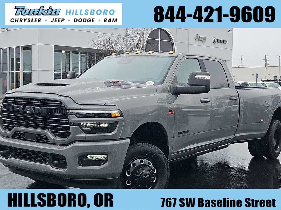 2026 Ram 3500 Laramie Ceramic Gray Clearcoat 6.7L I6 4WD 8-Speed Automatic#1 Seat Foam Cushion, 10 Speakers, 115V Auxiliary Rear Power Outlet, 14.4" Touchscreen Display, 17 Speaker Harman/Kardon Premium Sound, 2 Way Rear Headrest Seat, 2nd Row in Floor Storage Bins, 4 Way Front Headrests, 4-Wheel Disc Brakes, 4G LTE Wi-Fi Hot Spot, 50 Gallon Fuel Tank, 5th Wheel/Gooseneck Towing Prep Group, 6000# Front Axle with Hub Extension, ABS brakes, Active Lane Management System, Adaptive Steering System, Air Conditioning, Alexa Built-in, Alloy wheels, AM/FM radio: SiriusXM with 360L, Apple CarPlay, Apple CarPlay/Android Auto, Auto Adjust in Reverse Exterior Mirrors, Auto Dimming Exterior Passenger Mirror, Auto High Beam Headlamp Control, Auto Level Rear Air Suspension, Auto Power-Folding Mirrors, Auto-Dimming Exterior Mirrors, Auto-dimming Rear-View mirror, Automatic temperature control, Black Exterior Mirrors, Black Exterior Truck Badging, Black Wheel Center Hub, Body Color Grille Surround, Box and Rear Fender Clearance Lamps, Brake assist, Bucket Seats, Bumpers: body-color, Center Hub, Center Stop Lamp with Cargo View Camera, Chrome Exterior Mirrors, Clearance Lamps, Compass, Connected Travel and Traffic Services, Connectivity - US/Canada, Delay-off headlights, Disassociated Touchscreen Display, Driver door bin, Driver vanity mirror, Drowsy Driver Detection, Dual front impact airbags, Dual front side impact airbags, Dual Rear Wheels, Dual Wireless Charging Pad, Electronic Stability Control, Emergency Vehicle Alert System (EVAS), Exterior Mirrors Courtesy Lamps, Exterior Mirrors with Heating Element, Exterior Mirrors with Memory, Exterior Mirrors with Supplemental Signals, Foam Bottle Insert (door Trim Panel), Folding Flat Load Floor Storage, For Details Visit DriveUconnect.com, For More Info, Call 800-643-2112, Forward and Reverse Utility Lights, Front anti-roll bar, Front Center Armrest w/Storage, Front dual zone A/C, Front fog lights, Front License Plate Bracket, Front reading lights, Front Seat Back Map Pockets, Full Length Upgraded Floor Console, Fully automatic headlights, Garage door transmitter, Global Telematics Box Module, Gloss Black Grille Billets/Accents, Google Android Auto, GPS Antenna Input, GPS Navigation, HD Radio, Heated door mirrors, Heated Front Seats, Heated front seats, Heated Steering Wheel, Heated steering wheel, High Back Seats, Illuminated entry, Integrated Voice Command with Bluetooth, Laramie Level 2 Plus Equipment Group, Leather Trim 40/20/40 Bench Seat, Leather Trimmed Bucket Seats, LED Bed Lighting, Low tire pressure warning, Max Tow Package, Mirror Running Lights, MOPAR Deployable Bed Step, MOPAR Front and Rear Rubber Floor Mats, MOPAR Spray in Bedliner, MyFlexCare Service Diesel, Navigation System, Nexen Brand Tires, Night Edition, Occupant sensing airbag, Off-Road Information Pages, Outside temperature display, Overhead airbag, Overhead console, Panic alarm, ParkView Rear Back-Up Camera, Passenger door bin, Passenger vanity mirror, Power 2-Way Driver Lumbar Adjust, Power 2-Way Passenger Lumbar Adjust, Power Adjust 8-Way Driver Seat, Power Adjust 8-Way Front Passenger Seat, Power Adjust Mirrors, Power Adjustable Pedals with Memory, Power Deployable Running Boards, Power door mirrors, Power driver seat, Power Heat Fold Memory Telescopic Mirrors, Power passenger seat, Power steering, Power Sunroof, Power Telescoping Mirrors, Power windows, Power-Adjustable Convex Aux Mirrors, Quick Order Package 24H Laramie, Radio data system, Radio: Uconnect 5 Nav with 14.4" Display, Radio: Uconnect 5 Navigation with 12.0" Display, Radio/Driver Seat/Mirrors/Pedals Memory, Rain Sensitive Windshield Wipers, Rear 60/40 Folding Seat, Rear reading lights, Rear seat center armrest, Rear step bumper, Rear window defroster, Remote keyless entry, Remote Tailgate Release, Security system, Selectable Tire Fill Alert, SiriusXM Radio Service, SiriusXM with 360L, Price includes: $1000 - 2026 National Bonus Cash . Exp. 03/31/2026
