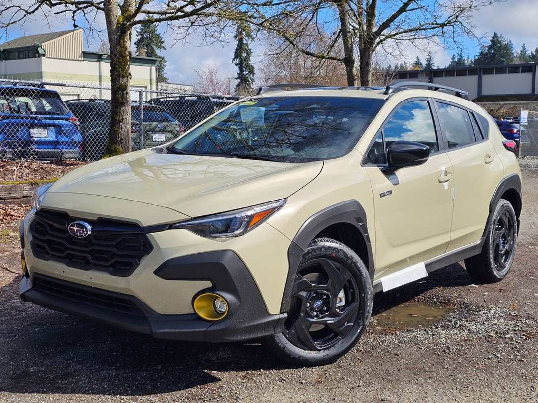 2026 Subaru Crosstrek Hybrid SportRecent Arrival!2026 Subaru Crosstrek Hybrid Sport 2.5L 4-Cylinder DOHC 16V Lineartronic CVT 4D Sport Utility AWD Sand Dune Pearl 2.5L 4-Cylinder DOHC 16V, 4-Wheel Disc Brakes, 6 Speakers, ABS brakes, Air Conditioning, Alloy wheels, AM/FM radio: SiriusXM, Anti-whiplash front head restraints, Auto High-beam Headlights, Auto-Dimming Exterior Mirror with Approach Light, Auto-Dimming Mirror with Compass and HomeLink, Automatic temperature control, Brake assist, Bumpers: body-color, Compass, Crosstrek Mirror Package, Driver door bin, Driver vanity mirror, Dual front impact airbags, Dual front side impact airbags, Electronic Stability Control, Emergency communication system: MySubaru Companion (5-years free), Exterior Parking Camera Rear, Footwell Illumination Kit, Four wheel independent suspension, Front anti-roll bar, Front Bucket Seats, Front Center Armrest, Front dual zone A/C, Front fog lights, Front reading lights, Fully automatic headlights, Heated door mirrors, Heated Front Bucket Seats, Heated front seats, Illuminated entry, Knee airbag, Leather Shift Knob, Leather steering wheel, LED Upgrade, Low tire pressure warning, Navigation System, Occupant sensing airbag, Outside temperature display, Overhead airbag, Overhead console, Panic alarm, Passenger door bin, Passenger vanity mirror, Power door mirrors, Power driver seat, Power moonroof, Power steering, Power windows, Radio data system, Radio: Subaru 11.6" Multimedia Navigation System, Rear anti-roll bar, Rear Bumper Cover, Rear seat center armrest, Rear side impact airbag, Rear window defroster, Rear window wiper, Remote keyless entry, Security system, Speed control, Speed-sensing steering, Splash Guards, Split folding rear seat, Spoiler, Sport Cloth Upholstery, Steering wheel mounted audio controls, Tachometer, Telescoping steering wheel, Tilt steering wheel, Traction control, Trip computer, Turn signal indicator mirrors, Variably intermittent wipers, Wheels: 18" x 7.0" J Dark Gray Aluminum-Alloy, 2.5L 4-Cylinder DOHC 16V.