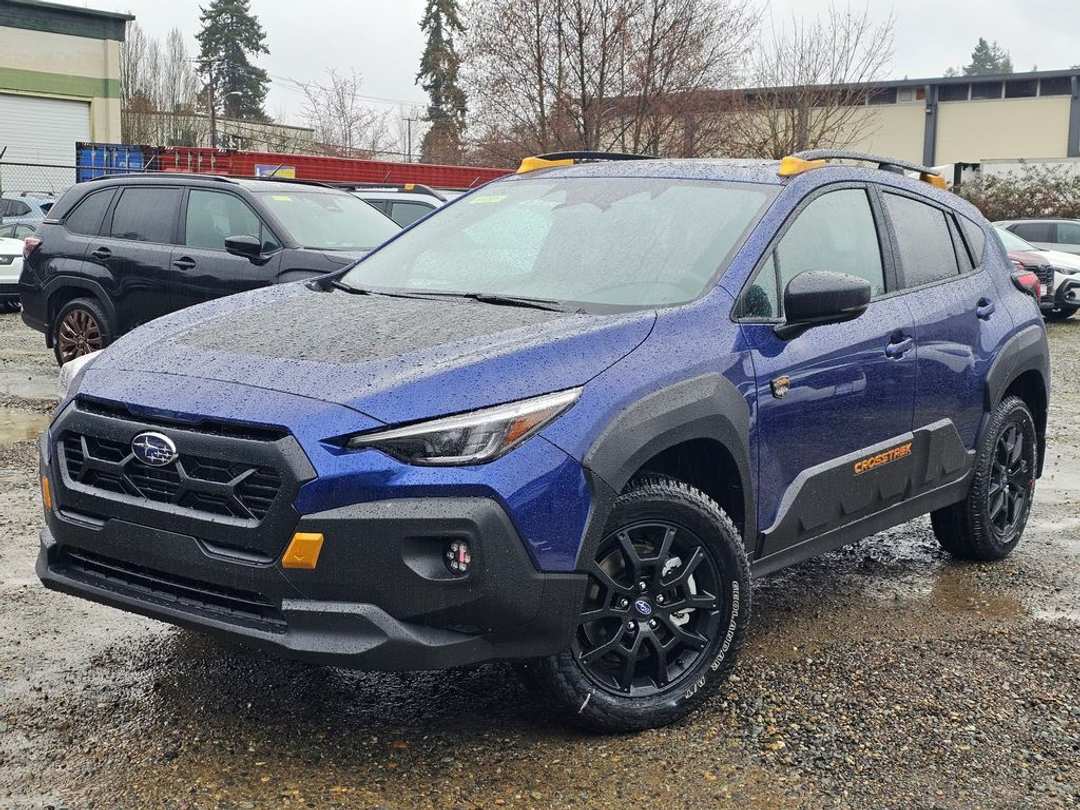 2026 Subaru Crosstrek Wilderness2026 Subaru Crosstrek Wilderness 2.5L 4-Cylinder DOHC 16V Lineartronic CVT 4D Sport Utility AWD Sapphire Blue 4-Wheel Disc Brakes, 6 Speakers, ABS brakes, Air Conditioning, Alloy wheels, AM/FM radio: SiriusXM with 360L, Anti-whiplash front head restraints, Auto High-beam Headlights, Auto-Dimming Exterior Mirror with Approach Light, Auto-Dimming Mirror with Compass and HomeLink, Automatic temperature control, Brake assist, Bumpers: body-color, Crosstrek Mirror Package, Driver door bin, Driver vanity mirror, Dual front impact airbags, Dual front side impact airbags, Electronic Stability Control, Emergency communication system: MySubaru Companion (5-years free), Exterior Parking Camera Rear, Footwell Illumination Kit, Four wheel independent suspension, Front anti-roll bar, Front Bucket Seats, Front Center Armrest, Front dual zone A/C, Front fog lights, Front reading lights, Fully automatic headlights, Heated door mirrors, Heated Front Bucket Seats, Heated front seats, Heated steering wheel, Illuminated entry, Knee airbag, Leather Shift Knob, Leather steering wheel, LED Upgrade, Low tire pressure warning, Occupant sensing airbag, Outside temperature display, Overhead airbag, Overhead console, Panic alarm, Passenger door bin, Passenger vanity mirror, Power door mirrors, Power steering, Power windows, Radio data system, Radio: Subaru 11.6" Multimedia Plus System, Rear anti-roll bar, Rear seat center armrest, Rear side impact airbag, Rear window defroster, Rear window wiper, Remote keyless entry, Security system, Speed control, Speed-sensing steering, Splash Guards - Wilderness, Split folding rear seat, Spoiler, Steering wheel mounted audio controls, Tachometer, Telescoping steering wheel, Tilt steering wheel, Traction control, Trip computer, Turn signal indicator mirrors, Variably intermittent wipers, Wheels: 17" x 7.0" J Matte Black Aluminum-Alloy, Wilderness StarTex Upholstery.