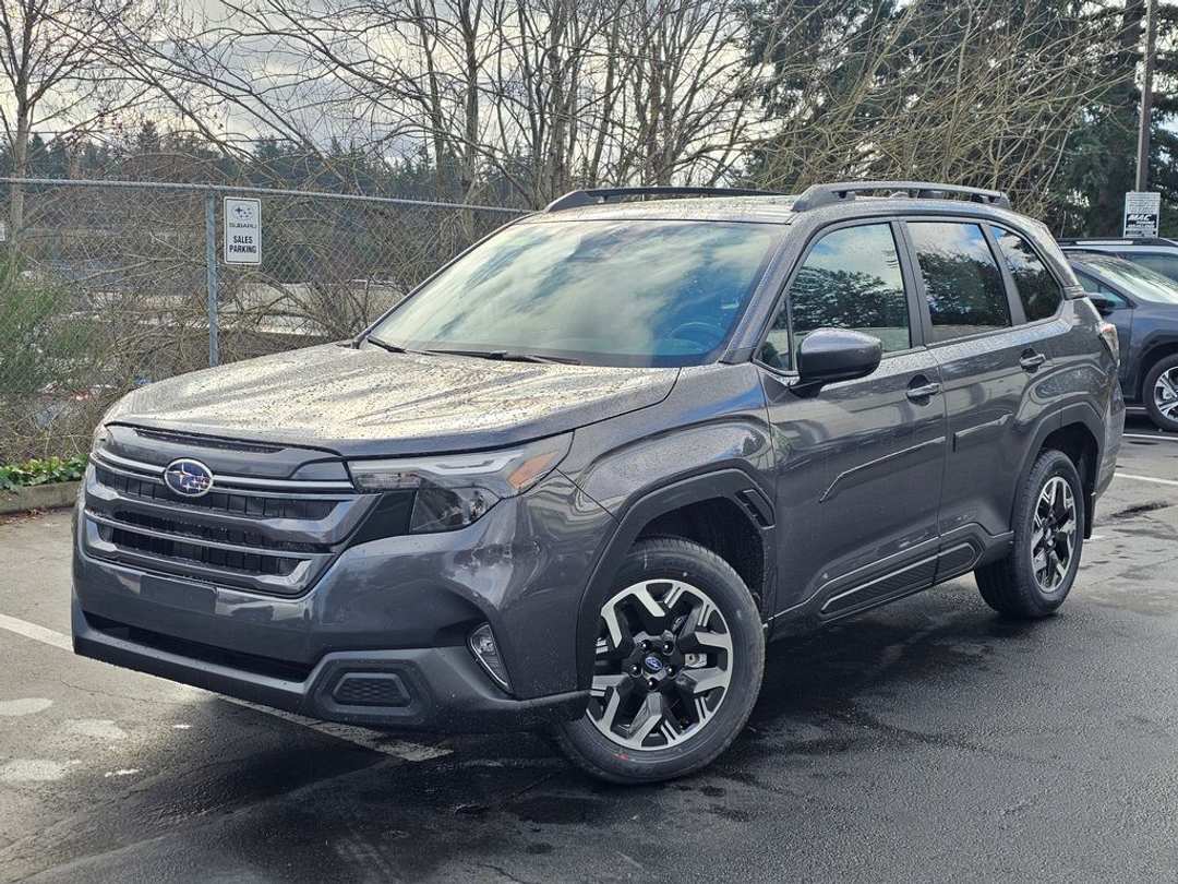 2026 Subaru Forester Premium2026 Subaru Forester Premium 2.5L 4-Cylinder DOHC 16V Lineartronic CVT 4D Sport Utility AWD Gray 4-Wheel Disc Brakes, 6 Speakers, ABS brakes, Air Conditioning, Alloy wheels, AM/FM radio: SiriusXM with 360L, Anti-whiplash front head restraints, Auto High-beam Headlights, Automatic temperature control, Body Side Molding - Magnetite Gray Metallic, Brake assist, Bumpers: body-color, Door Projector Lights, Driver door bin, Driver vanity mirror, Dual front impact airbags, Dual front side impact airbags, Electronic Stability Control, Emergency communication system: MySubaru Companion (5-years free), Exterior Parking Camera Rear, Footwell Illumination Kit, Four wheel independent suspension, Front anti-roll bar, Front Bucket Seats, Front Center Armrest, Front dual zone A/C, Front fog lights, Front reading lights, Fully automatic headlights, Heated door mirrors, Heated Front Bucket Seats, Heated front seats, Illuminated entry, Knee airbag, Leather steering wheel, Low tire pressure warning, Occupant sensing airbag, Outside temperature display, Overhead airbag, Overhead console, Panic alarm, Passenger door bin, Passenger vanity mirror, Power door mirrors, Power driver seat, Power moonroof: Panoramic, Power steering, Power windows, Premium Textured Cloth Upholstery, Radio data system, Radio: Subaru 11.6" Multimedia Plus System, Rear anti-roll bar, Rear Bumper Cover, Rear seat center armrest, Rear window defroster, Rear window wiper, Remote keyless entry, Security system, Speed control, Speed-sensing steering, Splash Guards, Split folding rear seat, Spoiler, Steering wheel mounted audio controls, Tachometer, Telescoping steering wheel, Tilt steering wheel, Traction control, Trip computer, Variably intermittent wipers, Wheels: 17" x 7.0 J Dark Metallic Aluminum-Alloy.