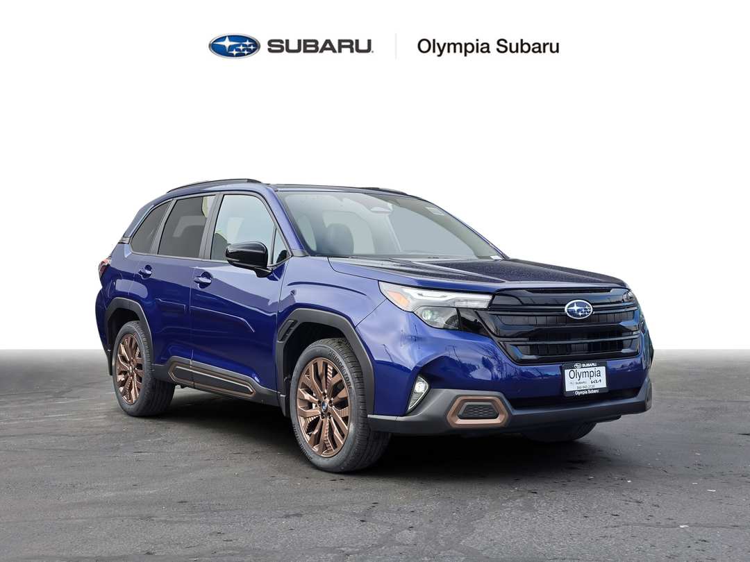Features 4-Wheel Disc Brakes 4WD type (full time) 6 Speakers ABS (4-wheel) ABS brakes AM/FM radio: SiriusXM with 360L Active grille shutters Adaptive cruise control Description 2026 Subaru Forester Sport Sapphire Blue Pearl Sport AWD Lineartronic CVT 2.5L 4-Cylinder DOHC 16V 4-Wheel Disc Brakes, 6 Speakers, ABS brakes, Air Conditioning, Alloy wheels, AM/FM radio: SiriusXM with 360L, Anti-whiplash front head restraints, Auto High-beam Headlights, Auto-Dimming Exterior Mirror with Approach Light, Auto-Dimming Mirror with Compass and HomeLink, Automatic temperature control, Body Side Molding - Sapphire Blue Pearl, Brake assist, Bumpers: body-color, Cargo Tray, Driver door bin, Driver vanity mirror, Dual front impact airbags, Dual front side impact airbags, Electronic Stability Control, Emergency communication system: MySubaru Companion (5-years free), Exterior Parking Camera Rear, Four wheel independent suspension, Front anti-roll bar, Front Bucket Seats, Front Center Armrest, Front dual zone A/C, Front fog lights, Front reading lights, Fully automatic headlights, Harman/Kardon Speaker System, Harman/Kardon Speaker System and Power Rear Gate and Reverse Automatic Braking, Heated door mirrors, Heated Front Bucket Seats, Heated front seats, Illuminated entry, Knee airbag, Leather steering wheel, Low tire pressure warning, Occupant sensing airbag, Outside temperature display, Overhead airbag, Overhead console, Panic alarm, Passenger door bin, Passenger vanity mirror, Power door mirrors, Power driver seat, Power moonroof: Panoramic, Power Rear Gate, Power steering, Power windows, Radio data system, Radio: Subaru 11.6" Multimedia Plus System, Rear anti-roll bar, Rear seat center armrest, Rear window defroster, Rear window wiper, Remote keyless entry, Reverse Automatic Braking (RAB) System, Security system, SI-Drive Dual-Mode Engine Performance Management, Speed control, Speed-sensing steering, Splash Guards, Split folding rear seat, Spoiler, Sport StarTex Upholstery, Steering wheel mounted audio controls, Tachometer, Telescoping steering wheel, Tilt steering wheel, Traction control, Trip computer, Turn signal indicator mirrors, Variably intermittent wipers, Wheels: 19" x 7.5 J Bronze Finish Aluminum-Alloy.