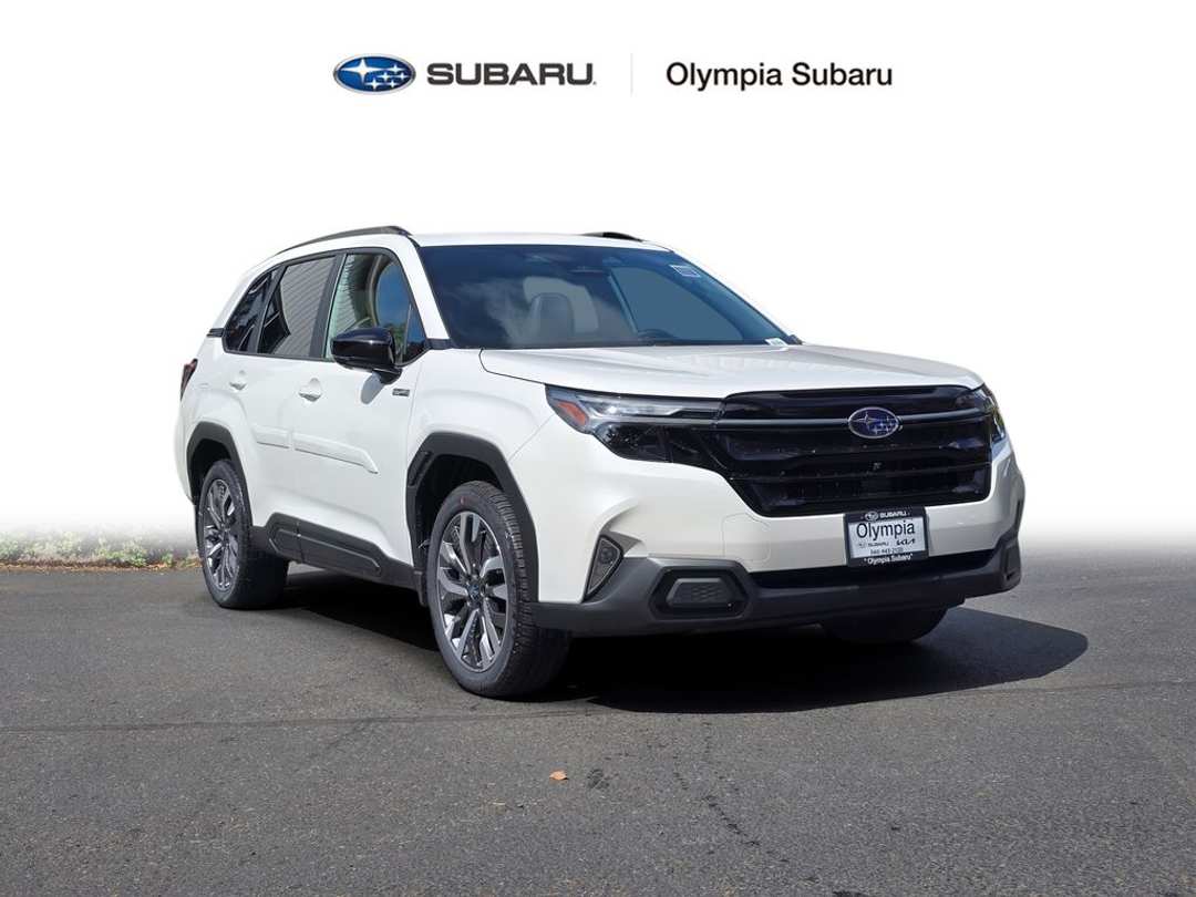 2026 Subaru Forester Touring HybridRecent Arrival!2026 Subaru Forester Touring Hybrid 2.5L 4-Cylinder DOHC 16V Lineartronic CVT 4D Sport Utility AWD Wh8 11 Speakers, 4-Wheel Disc Brakes, ABS brakes, Air Conditioning, Alloy wheels, AM/FM radio: SiriusXM with 360L, Anti-whiplash front head restraints, Auto High-beam Headlights, Auto-Dimming Exterior Mirror with Approach Light, Automatic temperature control, Body Side Molding - Crystal White Pearl, Brake assist, Bumpers: body-color, Compass, Driver door bin, Driver vanity mirror, Dual front impact airbags, Dual front side impact airbags, Electronic Stability Control, Emergency communication system: MySubaru Companion (5-years free), Exterior Parking Camera Rear, Four wheel independent suspension, Front anti-roll bar, Front Bucket Seats, Front Center Armrest, Front dual zone A/C, Front fog lights, Front reading lights, Fully automatic headlights, harman/kardon® Speakers, Heated and Ventilated Front Bucket Seats, Heated door mirrors, Heated front seats, Heated rear seats, Heated steering wheel, HVAC memory, Illuminated entry, Knee airbag, LED Upgrade, Low tire pressure warning, Memory seat, Navigation System, Occupant sensing airbag, Outside temperature display, Overhead airbag, Overhead console, Panic alarm, Passenger door bin, Passenger vanity mirror, Perforated Leather-Trimmed Upholstery, Power door mirrors, Power driver seat, Power Liftgate, Power moonroof: Panoramic, Power passenger seat, Power steering, Power windows, Radio data system, Radio: Subaru 11.6" Multimedia Navigation System, Rear anti-roll bar, Rear seat center armrest, Rear window defroster, Rear window wiper, Remote keyless entry, Security system, Speed control, Speed-sensing steering, Splash Guards, Split folding rear seat, Spoiler, Standard Model, Steering wheel mounted audio controls, Tachometer, Telescoping steering wheel, Tilt steering wheel, Traction control, Trip computer, Turn signal indicator mirrors, Variably intermittent wipers, Ventilated front seats, Wheels: 19" x 7.5 J Dark Gray Aluminum-Alloy.