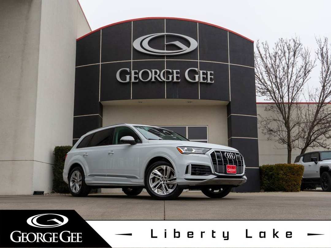 White 2022 Audi Q7 55 Premium Plus quattro quattro 8-Speed Automatic with Tiptronic 3.0L TFSI 10 Speakers, 3.204 Axle Ratio, 3rd row seats: bench, 4-Wheel Disc Brakes, ABS brakes, Air Conditioning, Alloy wheels, AM/FM radio: SiriusXM, Audi smartphone interface (Apple CarPlay/Android Auto), Auto High-beam Headlights, Auto-dimming door mirrors, Auto-dimming Rear-View mirror, Automatic temperature control, Brake assist, Bumpers: body-color, Compass, Delay-off headlights, Driver door bin, Driver vanity mirror, Dual front impact airbags, Dual front side impact airbags, Electronic Stability Control, Emergency communication system: Audi connect CARE, PRIME & PLUS, Exterior Parking Camera Rear, Four wheel independent suspension, Front anti-roll bar, Front Bucket Seats, Front Center Armrest, Front dual zone A/C, Front fog lights, Front reading lights, Fully automatic headlights, Garage door transmitter: HomeLink, Genuine wood door panel insert, Heated door mirrors, Heated Front Bucket Seats, Heated front seats, Illuminated entry, Leather Seating Surfaces, Leather Shift Knob, Leather steering wheel, Low tire pressure warning, Memory seat, Navigation system: Audi MMI Navigation plus with Touch Response, Occupant sensing airbag, Outside temperature display, Overhead airbag, Overhead console, Panic alarm, Passenger door bin, Passenger vanity mirror, Power door mirrors, Power driver seat, Power Liftgate, Power moonroof: Panoramic, Power passenger seat, Power steering, Power windows, Radio data system, Radio: Audi Sound System, Rain sensing wipers, Rear air conditioning, Rear anti-roll bar, Rear fog lights, Rear reading lights, Rear seat center armrest, Rear side impact airbag, Rear window defroster, Rear window wiper, Reclining 3rd row seat, Remote keyless entry, Roof rack: rails only, Security system, Speed control, Speed-sensing steering, Split folding rear seat, Spoiler, Steering wheel memory, Steering wheel mounted audio controls, Tachometer, Telescoping steering wheel, Tilt steering wheel, Traction control, Trip computer, Turn signal indicator mirrors, Variably intermittent wipers, Wheels: 19" 5-Arm-Star Design.