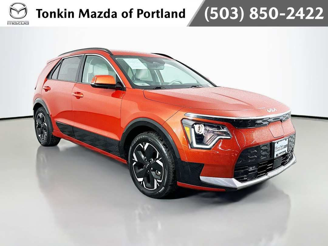 WIND PRESERVE PACKAG! CARFAX One-Owner. Fire Orange 2023 Kia Niro EV Wind 4D Sport Utility Electric Motor 1-Speed Automatic FWD 4-Wheel Disc Brakes, 6 Speakers, ABS brakes, Air Conditioning, AM/FM radio: SiriusXM, Android Auto, Apple CarPlay, Apple CarPlay & Android Auto, Auto High-beam Headlights, Automatic temperature control, Back Up Camera, Backup Camera, Blind Spot, BlueTooth, Brake assist, Bumpers: body-color, Carpet Floor Mats, Cloth & Vegan Leather-Trimmed Seats, Delay-off headlights, Driver door bin, Driver vanity mirror, Dual front impact airbags, Dual front side impact airbags, Electronic Stability Control, Emergency communication system: Kia Connect (includes 1 year free trial), Four wheel independent suspension, Front anti-roll bar, Front Bucket Seats, Front Center Armrest, Front dual zone A/C, Front reading lights, Fully automatic headlights, Heat Pump, Heated door mirrors, Heated Front Bucket Seats, Heated front seats, Heated Rear Seats, Heated Seats, Heated Steering Wheel, Illuminated entry, Keyless Entry, Knee airbag, Light Gray Interior Color Package, Low tire pressure warning, Navigation System, Occupant sensing airbag, Outside temperature display, Overhead airbag, Overhead console, Panic alarm, Passenger vanity mirror, Power door mirrors, Power driver seat, Power Liftgate, Power steering, Power windows, Radio: Audio System, Rear anti-roll bar, Rear seat center armrest, Rear window defroster, Remote keyless entry, Security system, Speed control, Speed-sensing steering, Split folding rear seat, Spoiler, Steering wheel mounted audio controls, Telescoping steering wheel, Tilt steering wheel, Traction control, Trip computer, Turn signal indicator mirrors, Two-Level Luggage Board, Wind Preserve Package.Odometer is 3651 miles below market average!126/101 City/Highway MPG 126/101 City/Highway MPG