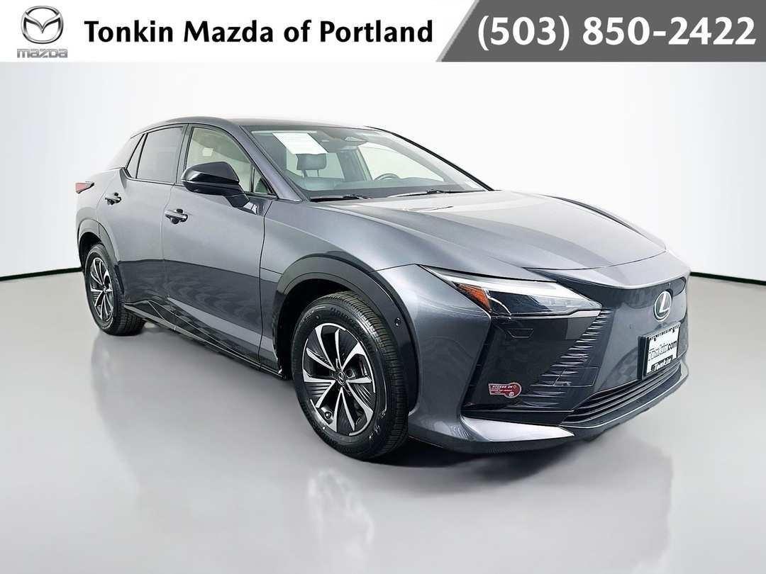 CARFAX One-Owner. Cloudburst Gray 2023 Lexus RZ 450e Premium 4D Sport Utility Electric Motor Single-Speed Automatic AWD 10 Speakers, 4-Wheel Disc Brakes, ABS brakes, Air Conditioning, Alloy wheels, AM/FM radio: SiriusXM, Android Auto, Apple CarPlay, Apple CarPlay/Android Auto, Auto High-beam Headlights, Auto-dimming door mirrors, Auto-dimming Rear-View mirror, Automatic temperature control, Back Up Camera, Backup Camera, Blind Spot, BlueTooth, Brake assist, Bumpers: body-color, Delay-off headlights, Digital Key, Driver door bin, Driver vanity mirror, Dual front impact airbags, Dual front side impact airbags, Electronic Stability Control, Emergency communication system: Safety Connect (10-year trial), Four wheel independent suspension, Front anti-roll bar, Front Bucket Seats, Front Center Armrest, Front dual zone A/C, Front reading lights, Fully automatic headlights, Heads-Up Display, Heated & Ventilated Front Bucket Seats, Heated door mirrors, Heated front seats, Heated Seats, Heated steering wheel, Illuminated entry, Intelligent Parking Assist, Keyless Entry, Knee airbag, Low tire pressure warning, Memory seat, Navigation System, NuLuxe Seat Trim, Occupant sensing airbag, Outside temperature display, Overhead airbag, Overhead console, Panic alarm, Panorama Roof, Passenger vanity mirror, Power door mirrors, Power driver seat, Power Liftgate, Power passenger seat, Power steering, Power windows, Radio data system, Radio: Lexus Interface, Rear anti-roll bar, Rear seat center armrest, Rear window defroster, Remote keyless entry, Security system, Speed control, Speed-sensing steering, Split folding rear seat, Spoiler, Steering wheel memory, Steering wheel mounted audio controls, Technology Package, Telescoping steering wheel, Tilt steering wheel, Traction control, Trip computer, Turn signal indicator mirrors, Ventilated front seats.